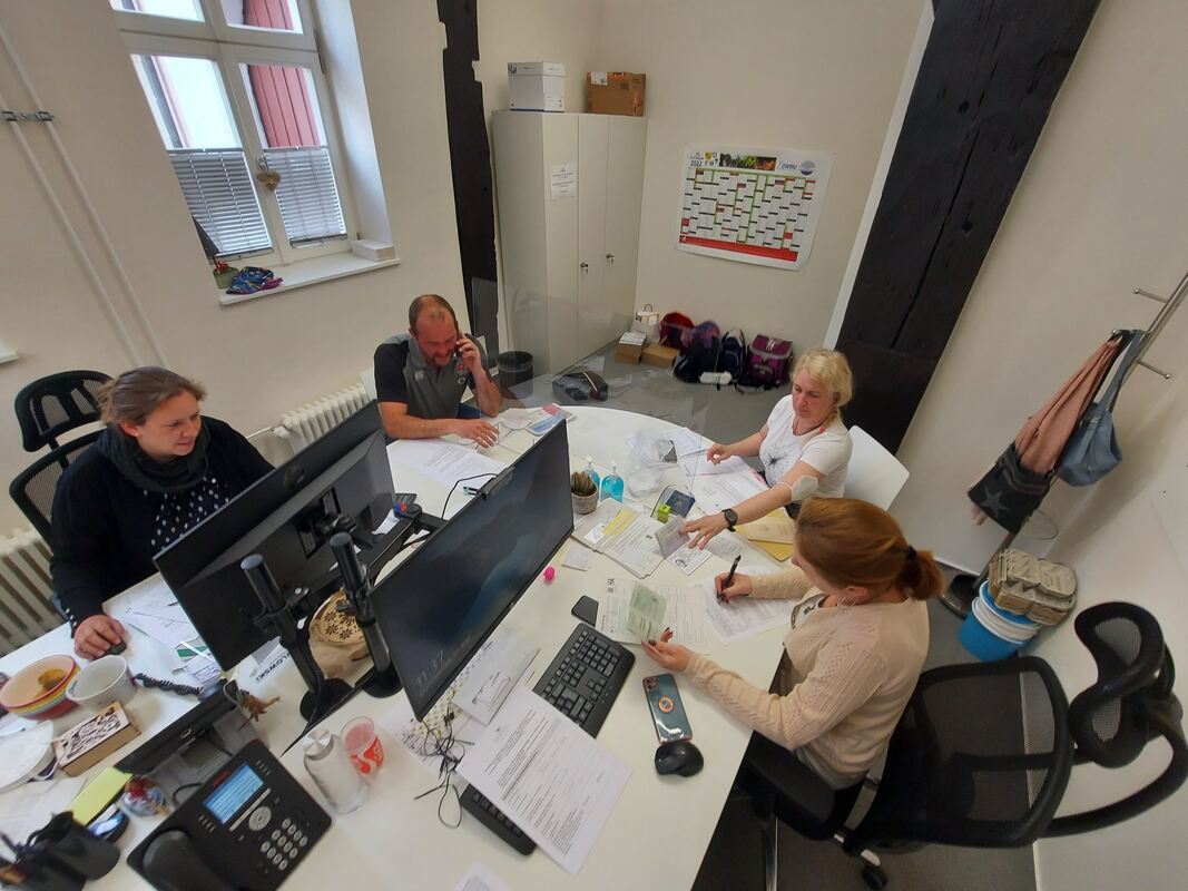 Im Büro von Stefanie von Pawlowski (links) und Ruben Stapelbroek laufen im Uracher Rathaus die Fäden zusammen, wenn's um Geflüchtete aus der Ukraine geht. Victoria Miteva (rechts), die wie Liudmila Luzanova (nicht im Bild) seit Kurzem eine 50-Prozent-Stelle in der Uracher Verwaltung hat, kümmert sich hier gerade um die Papiere einer Ukrainerin. Hinten im Raum stehen ein paar Schulranzen – Spenden. »Hier landet ganz viel«, sagt Stefanie von Pawlowski, »wir kümmern uns um alles.«