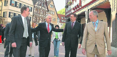 Gute Stimmung: Der baden-württembergische Justizminister Ulrich Goll besuchte am Mittwochabend Bad Urach. Er schlenderte mit Bürgermeister Markus Ewald (links) und Walter Vatter und Otto Jetter (rechts) von der FDP über den Marktplatz.