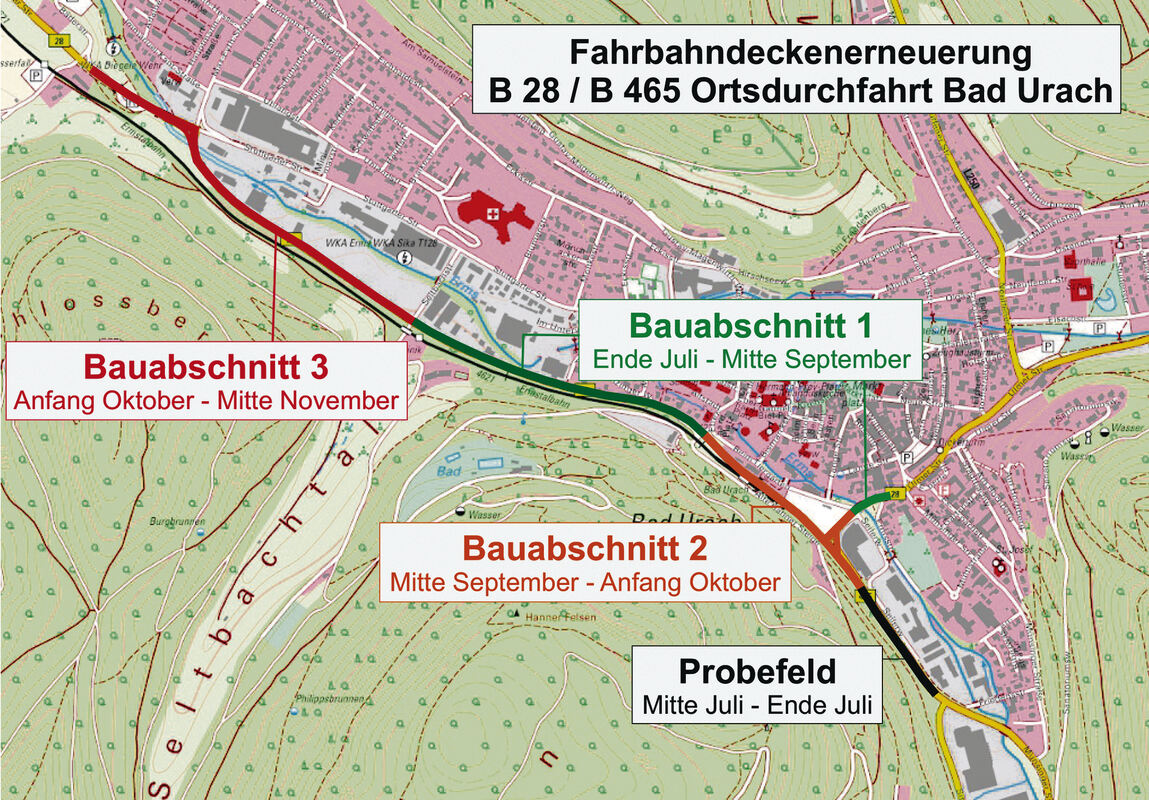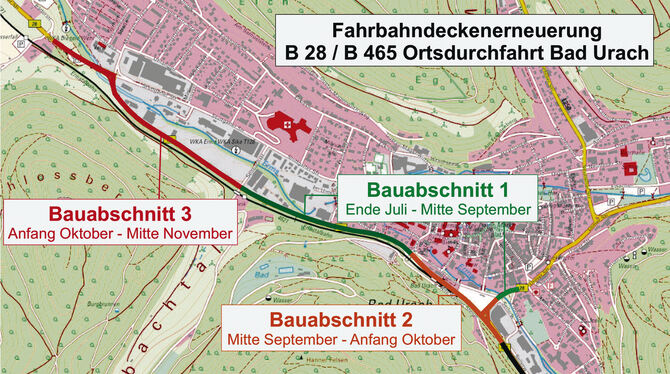 Ein Überblick über die Fahrbahn- erneuerung auf der B 28 und B 465 in der Ortsdurchfahrt von Bad Urach. Am 20. Juli soll die Großbaustelle beginnen – und mit ihr die örtlichen und überörtlichen Umleitungen. GRAFIK: REGIERUNGSPRÄSIDIUM TÜBINGEN
