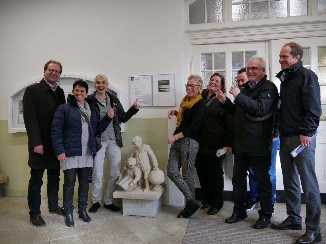 Jan Cidylo, der Hausmeister der Sieben-Keltern-Schule Metzingen, hängt die Plakette der Architektenkammer Baden-Württemberg – den Dr. Ursula Broermann-Preis für beispielhaftes barrierefreies Bauen – auf. Darüber freuen sich (von links) Steffen Rothweiler, Ute Kern-Waidelich, Jacqueline Lohde, Doris Hertkorn-Gärtner, Astrid Siems, Peter Warmboldt, Konrad Berger und Sebastian Krieg.