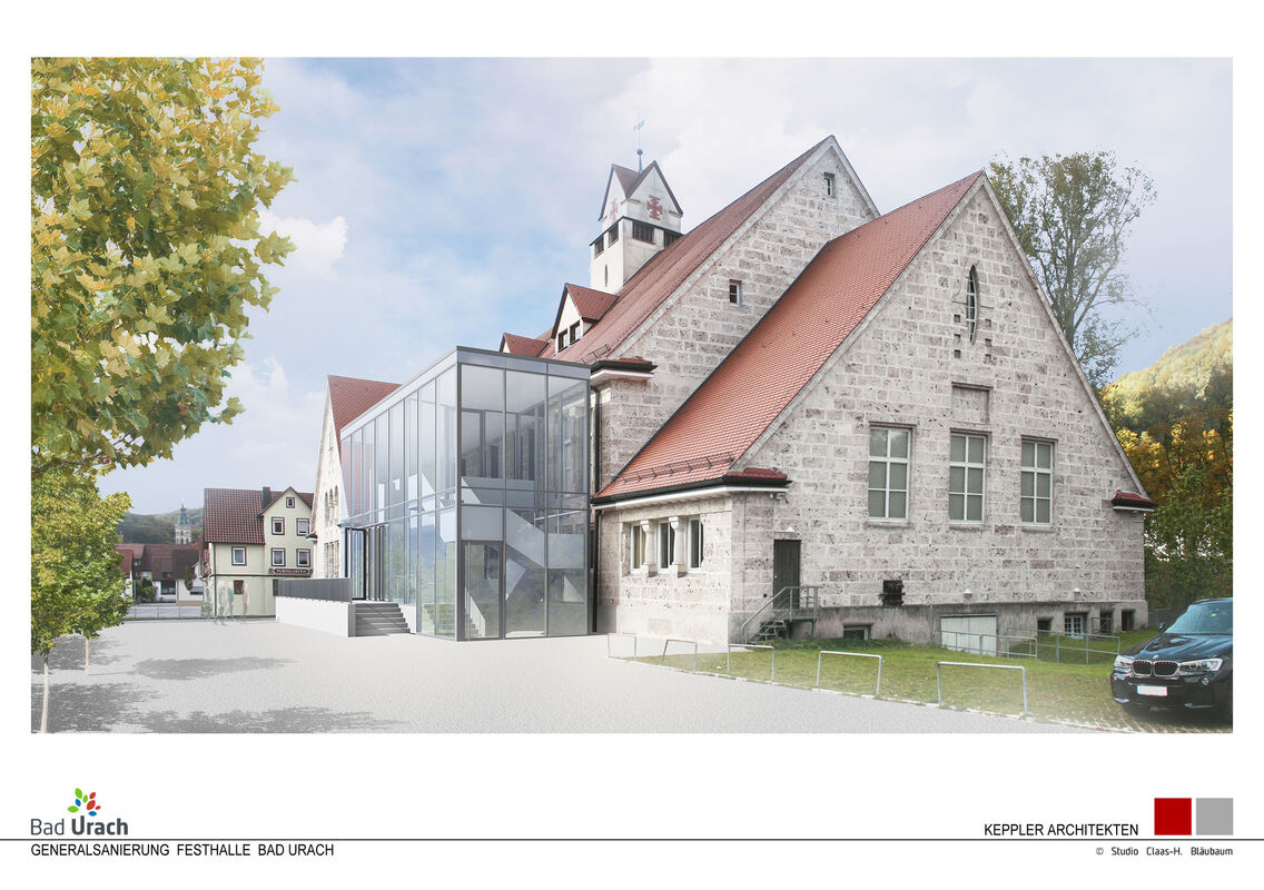 Jetzt bekommt die Festhalle, die früher mal eine »Turn- und Festhalle« war, eine komplette Verjüngungskur. Ein wesentlicher Bestandteil wird der gläserne Anbau sein, den der Uracher Architekt Gerhard Keppler an der Südseite geplant hat – dort, wo derzeit eine weitgehend ungenutzte »Terrasse« liegt. Der Keppler’schen Glasanbau schafft Platz für ein Treppenhaus, wobei im zweiten Stock ein Steg zu einem kleineren, etwa 70 Quadratmeter großen Foyerbereich führt. Von dort aus kann dann die Empore betreten werden. Vom unteren Stock des Anbaus geht’s künftig rein in die eigentliche Festhalle, wobei der Haupteingang an der Front des Gebäudes bleiben wird – das prachtvolle Entrée soll nach dem Willen des Architekts nicht zu einem Nebeneingang degradiert werden.