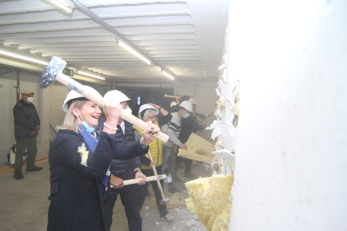 BAD URACH. Viele Jahre schon redet man in der Kurstadt vom Umbau und der Sanierung der Festhalle. Jetzt geht’s los: Am Donnerstagabend haben Vertreter der Uracher Verwaltung, des Gemeinderats, der Architekturbüros und des Fördervereins symbolisch eine Mauer im Keller eingerissen – ein »Baggerbiss« der etwas anderen Art. Die Baustelle steht von Anfang an unter einem gewissen Zeitdruck: Bis zum Sommer 2023, wo das 300-Jahre-Jubiläum des Schäferlaufs gefeiert wird, soll alles fertig sein. Der Grund: Zum Schäferlauf gehört nicht nur der Umzug durch die Stadt und der Wetz der Schäferinnen und Schäfer in der Zittelstatt, sondern auch das Festspiel »D’Schäferlies«. Und die kann eigentlich nur in der Festhalle über die Bühne gehen.
