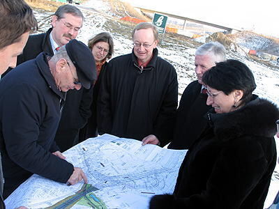 Die Staatssekretärin im Bundesverkehrsministerium, Karin Roth (rechts), lässt sich vom Metzinger Tiefbauamtsleiter Jürgen Vollmer den Fortgang der B 28-Baustelle erläutern. Im Hintergrund (von links) Bürgermeister Michael Lucke, der SPD-Landtagskandidat Klaus Käppeler und Oberbürgermeister Dieter Hauswirth.