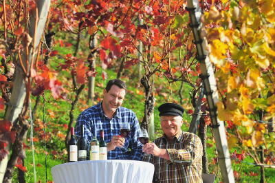 Im Glas glänzt ein Spätburgunder, im Holzfass gereift: Thomas Jud (links) und Gert Kiehlneker sind zurecht stolz auf heimische Weine als regionale Qualitätsprodukte.