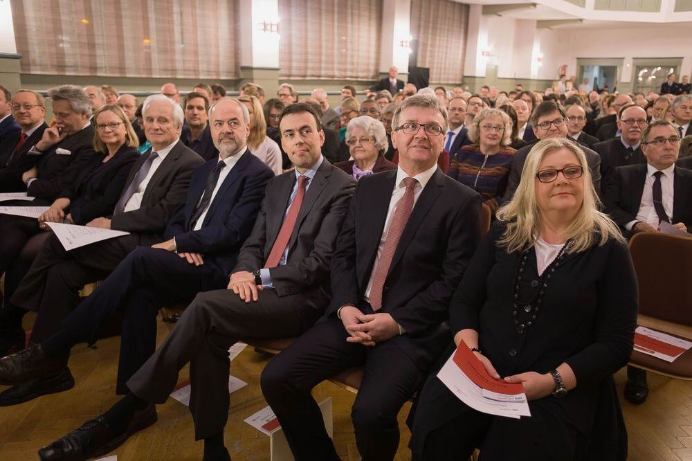 Die erste Reihe der Festhalle: (von rechts) Sylvia Rebmann, Bürgermeister Elmar Rebmann, Finanz- und Wirtschaftsminister Dr. Nils Schmid, Landrat Thomas Reumann, Alt-Landrat Dr. Edgar Wais, Professorin Sigrid Hirbodian, SKH Herzog Friedrich von Württemberg und SPD-Landtagsmitglied Klaus Käppeler. FOTO: TRINKHAUS