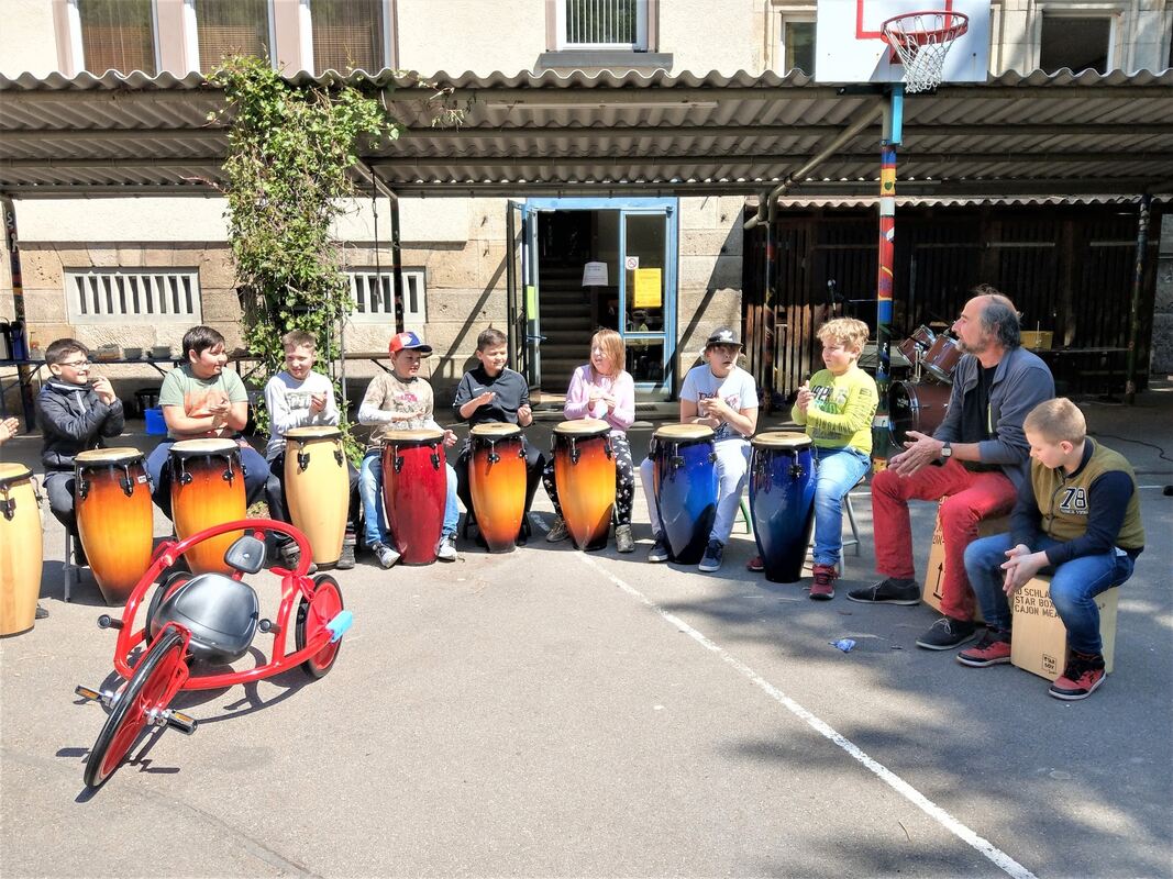 Die Trommlergruppe von Martin Bürck verlieh der Geburtstagsfeier an der Uracher Wilhelmschule Rhythmus. FOTO: BÖHM