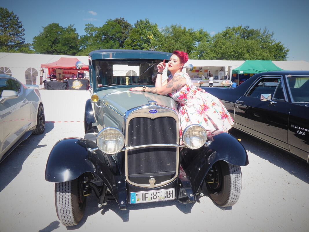 Eine Frau zeigt beim US-Car & Harley-Treffen einen Ford A von 1931. FOTO: BERNKLAU