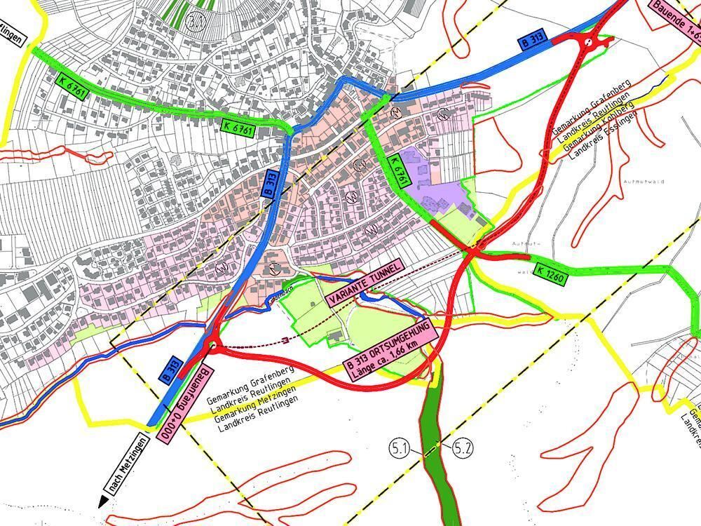Die Grafenberger werden nicht rot sehen, wenn sie auf diese Skizze blicken. Denn rötlich gehalten ist die künftige Ortsumfahrung im Süden der Gemeinde. Das Tübinger Regierungspräsidium hat für das Straßenbauprojekt jetzt das Planfeststellungsverfahren eröffnet. GEA-REPRO