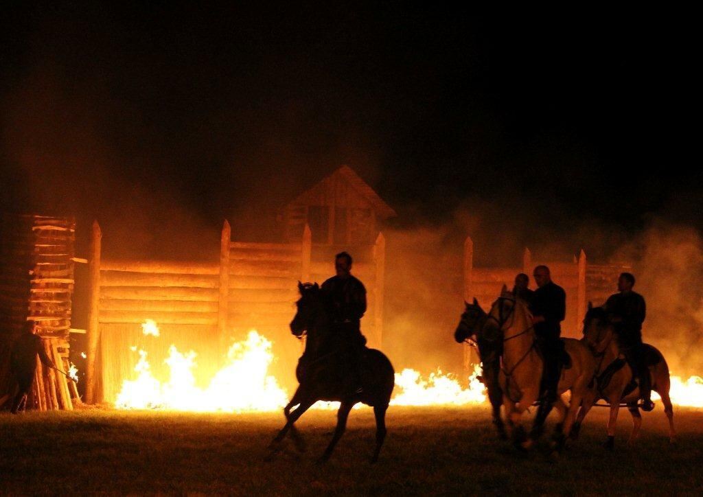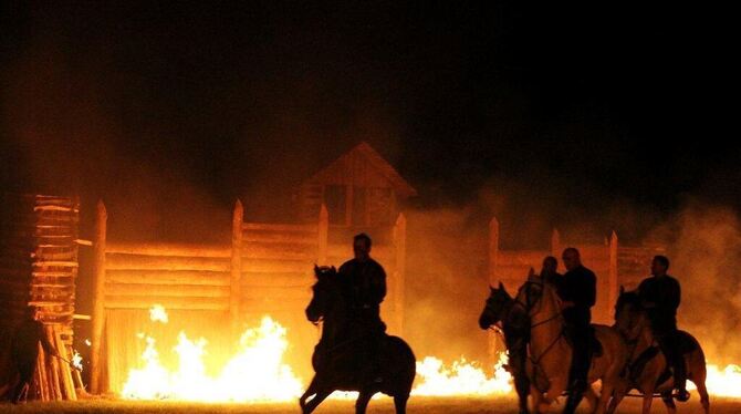 Höhenfeuer: Das keltische Zangentor steht in Flammen. Hunderte Neugierige sehen zu, wie es in Schutt und Asche fällt.