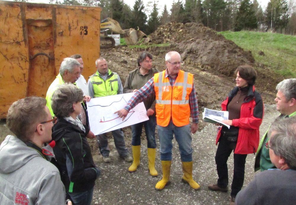 Erst hatte Walddorfhäslach mit Kosten in Höhe von 210 000 Euro gerechnet. Jetzt bleiben an der Gemeinde nur 16 000 Euro Mehrwertsteuer hängen. Bürgermeisterin Silke Höflinger im Gespräch mit den Bauleuten, Bauleiter Michael Russe erläutert den Plan. FOTO: MÜLLER