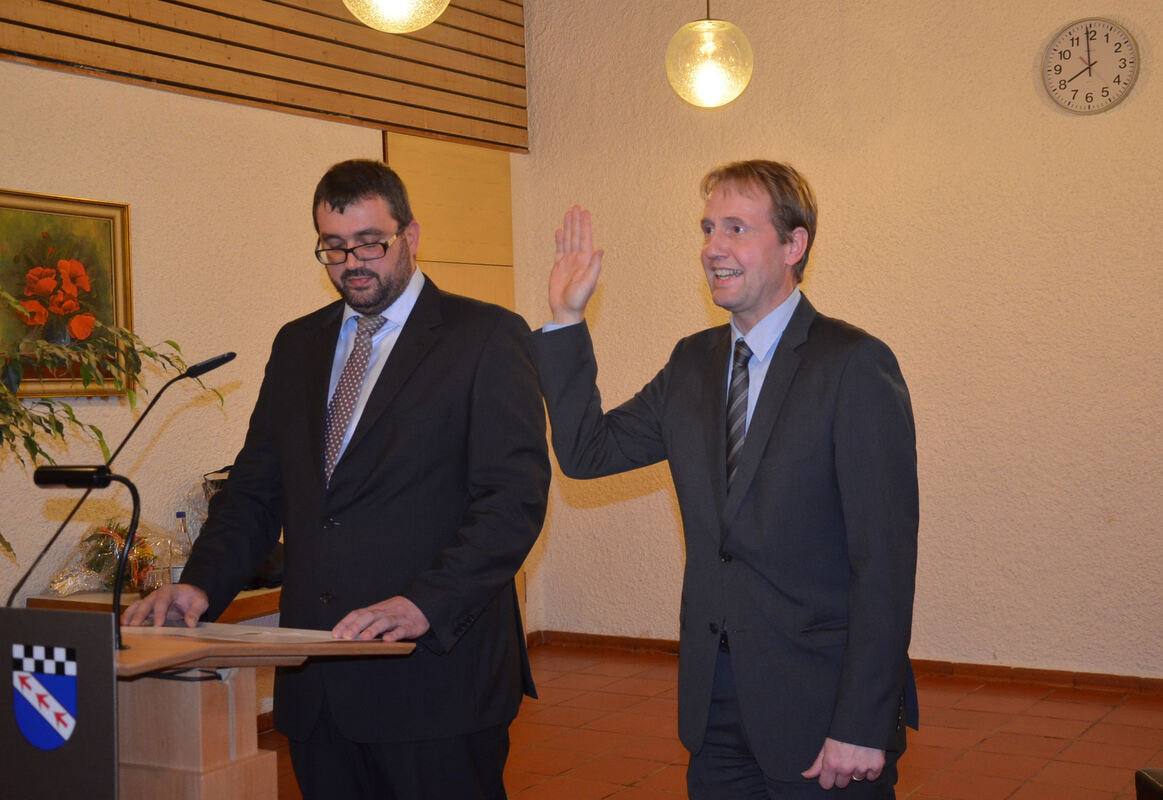 Bürgermeister Bernd Welser (rechts) legte, wie es guter Brauch ist, vor seinem ersten Stellvertreter Jens Hartlieb den Eid auf seine zweite Amtszeit als Bürgermeister von Bempflingen ab. FOTO: SANDER