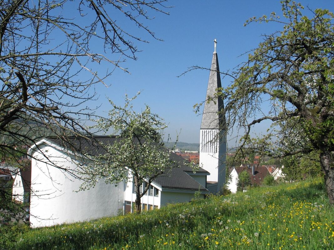 Nach den Plänen der Architekten Reutter aus Wernau konnte im Oktober 1962 mit dem Bau der Kirche begonnen werden. Der Baukörper fügt sich mit seinem parabelförmigen Grundriss und dem geschwungenen Dach harmonisch in die Landschaft ein. Im Innern verwandeln die Kirchenfenster, geschaffen von Christian Oehler, an einem sonnigen Tag den eher nüchternen Kirchenraum in ein Zelt für Licht und Farbe. Man spürt die Anwesenheit des Schöpfergottes in jedem Raum, in jedem Winkel.