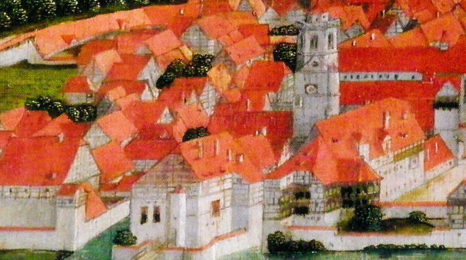 BAD URACH. Das Residenzschloss von Bad Urach ist eines der bekannten Wahrzeichen der Stadt und mit seinem Museum gleichzeitig ein Touristenziel. Dass es aber auch jahrhundertelang ein Wasserschloss in Urach gegeben hat, wissen nur wenige. Als in den 1990er-Jahren auf dem Hof der Wilhelmschule die alten Klassenzimmer abgerissen wurden, kamen massive Grundmauern zum Vorschein, die auf eine recht gut ausgebaute Stadtburg schließen ließen. Die Grafen von Urach hatten wohl im 11. Jahrhundert nicht nur auf dem naheliegenden Berg begonnen eine Höhenburg zu errichten, sondern zeitgleich auch eine Wohnburg in der Talsohle. Zu sehen ist die alte Stadtburg auf einem Bild, das der Familie Brendlin gewidmet ist und in der Amanduskirche hängt. Darüber hinaus existieren noch Pläne vom Bauwerk, die erst kurz vor seinem Abriss angefertigt worden waren.