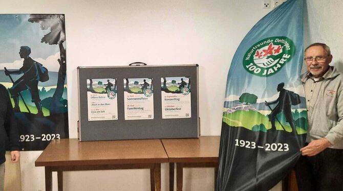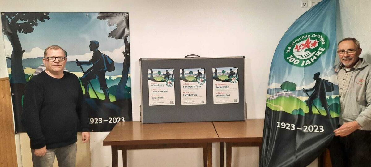 Die Dettinger Naturfreunde sind bestens vorbereitet auf das Doppel-Jubiläum 100 Jahre Naturfreunde und 70 Jahre Waldheim: Kai Münzing (links) und Karl-Eugen Buck präsentieren die eigens dafür gestalteten Banner.