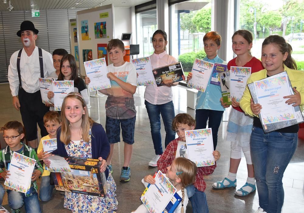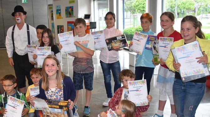 Die glücklichen jungen Gewinner des Malwettbewerbs im Bereich der Volksbank Ermstal-Alb mit Urkunde und Präsenten. FOTO: SANDER
