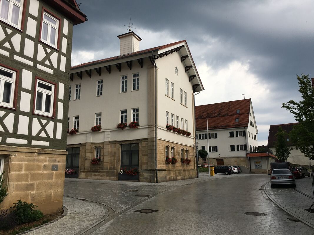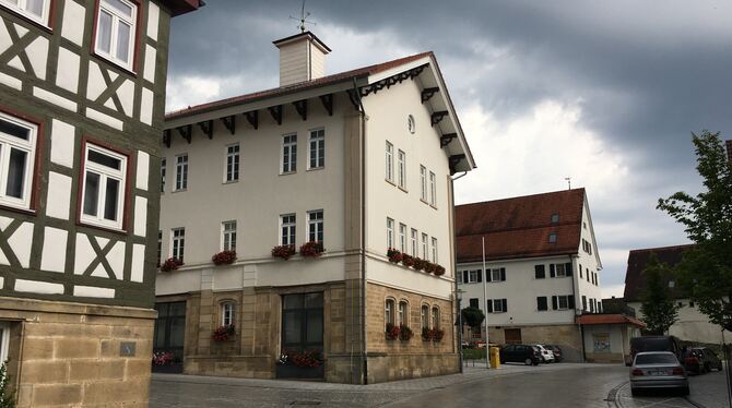 Über dem Rathaus mit der weißen Fassade und den vielen Blumenkästen hängen dunkle Gewitterwolken. Die Gemeinde will zwar 2025 trotz der geringeren Gewerbesteuereinnahmen investieren. Es werden aber auch Vorhabengeschoben.