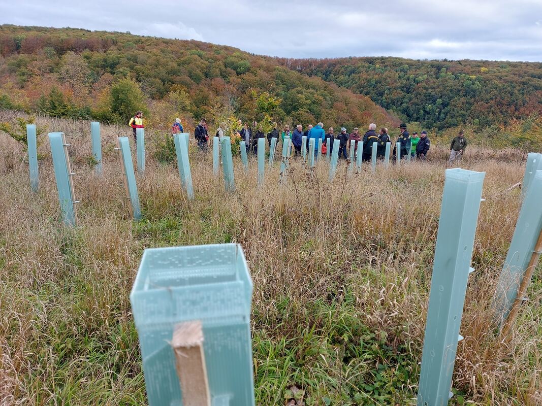 An dieser Stelle ist ein rotfauler Fichtenbestand abgegangen – der Forst hat sich für die Neupflanzung eines Waldes entschieden. Zum Schutz der Eichensetzlinge sind Wuchshüllen nötig.