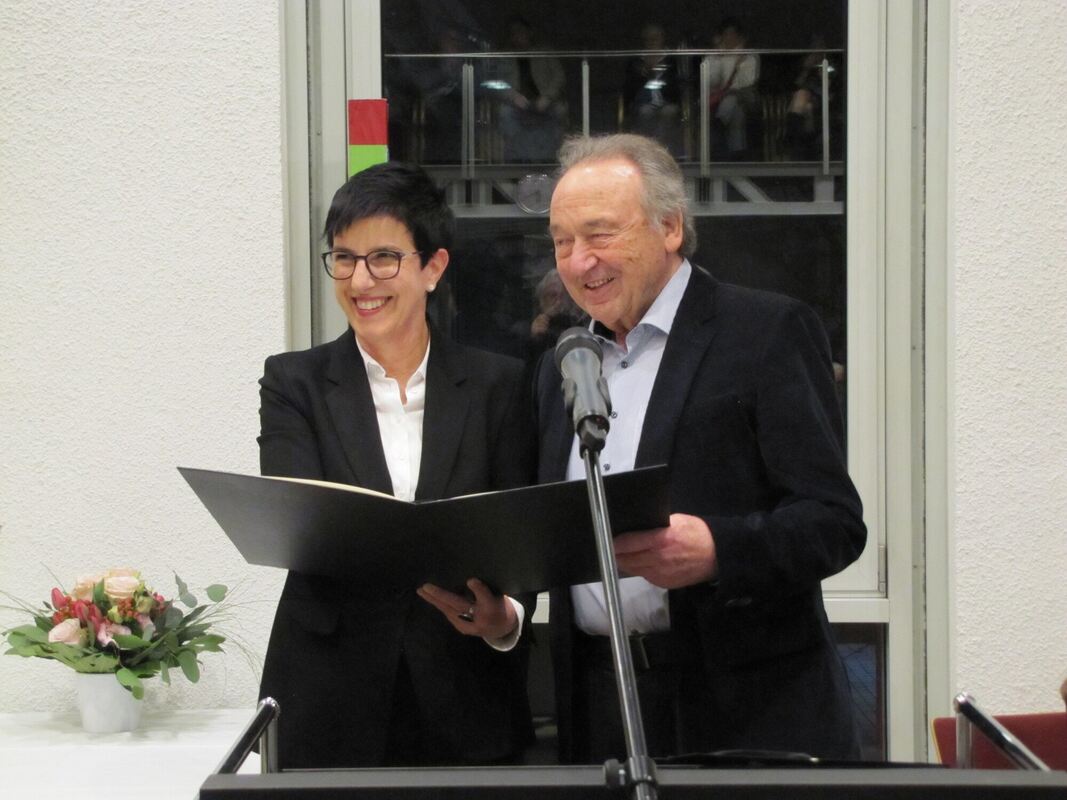 Metzingens Oberbürgermeisterin Carmen Haberstroh übrreicht dem ehemaligen Baubürgermeister Walter Veit die Ehrenbürgerwürde.