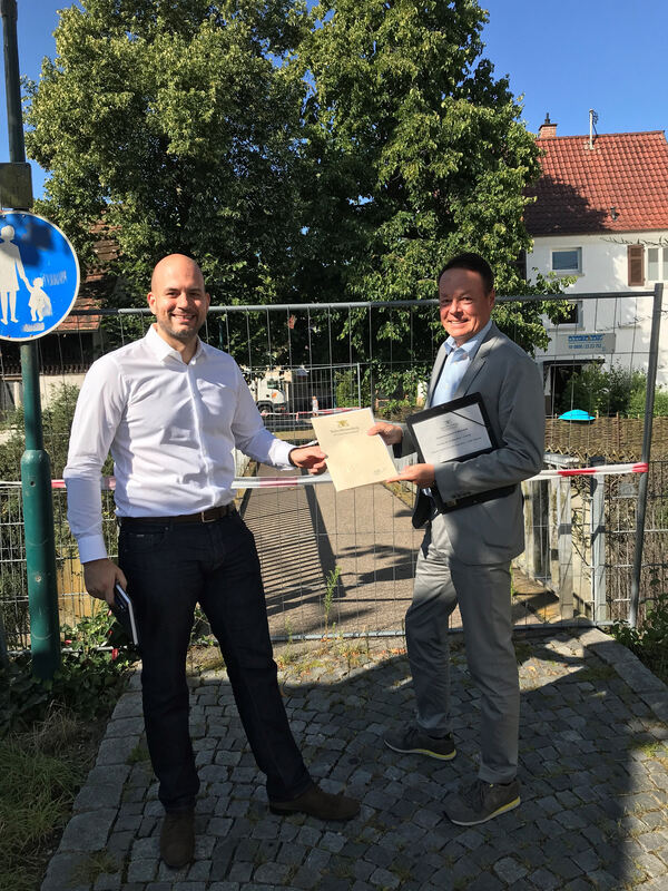 Im Herbst können die Bauarbeiten für einen neue Fußgängerbrücke über die Echaz beginnen. Regierungspräsident Klaus Tappeser überreichte Wannweils Bürgermeister Dr. Christian Majer den entsprechenden Förderbescheid über 72 000 Euro. FOTO: GEMEINDE