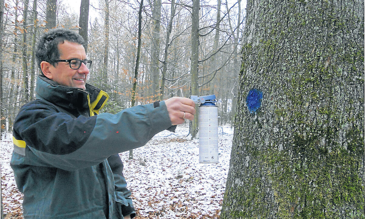Georg Baumbusch ist für den Wannweiler Forst zuständig. Auf diesem Archivbild zeigt der Revierleiter, wie er mit einem blauen Punkt aus einer ganz normalen Eiche einen Z-Baum macht - einen »Zukunftsbaum«. Das bedeutet: Dieser Baum soll weiter wachsen, sich ausdehnen, eine große Baumkrone entwickeln und darf nicht gefällt werden.