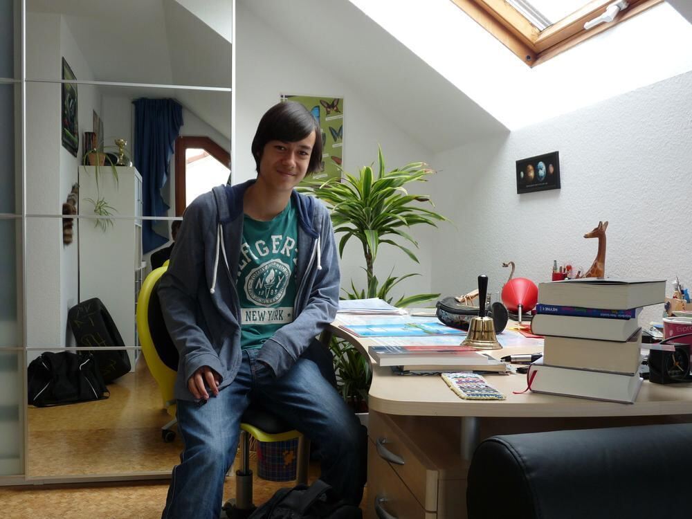 Argumentativ auf Zack: Nico Bosler versteht sich auf die Kunst des Debattierens. In der Regel bereitet er sich am heimischen Schreibtisch auf Wettbewerbe vor. Diesen ziert eine handgefertigte Glocke, die Nico jüngst für seine Qualifikation erhielt. FOTO: HÄRING