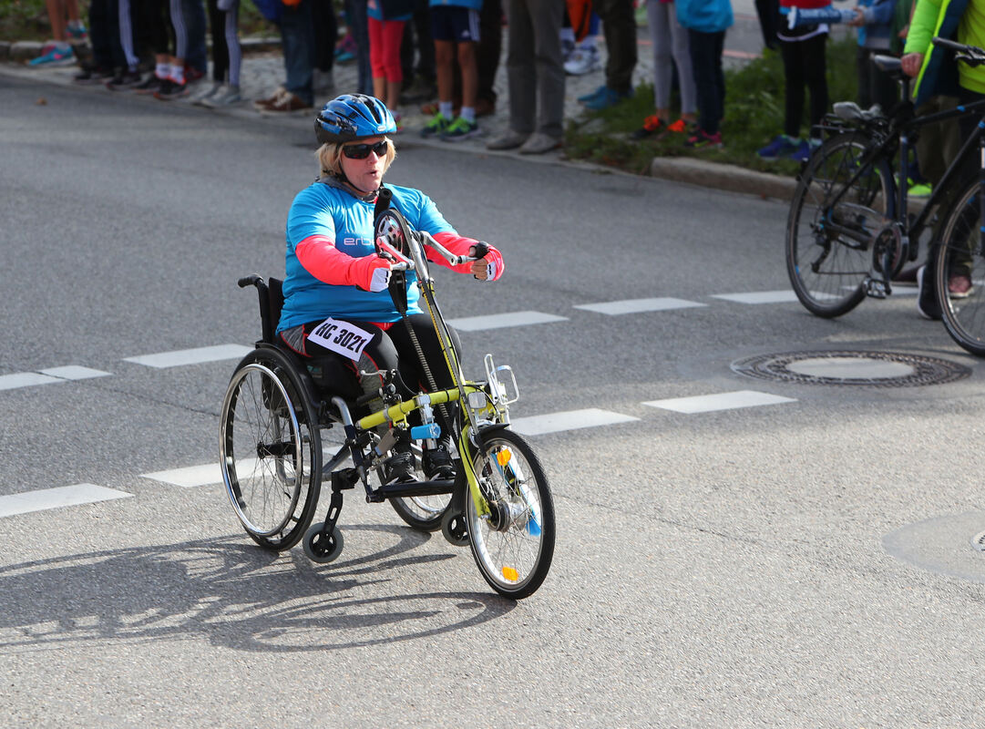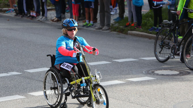 Beim Tübinger Erbelauf treibt die Handbike-Fahrerin ihr Gefährt mit der Handkurbel an. Mit der Erfindung von Tanja Heider können auch Menschen mit Handlähmungen ein solches Fahrzeug bedienen und die Kraft aus den Armen auf die Räder übertragen. FOTO: JÜRGEN LANGER
