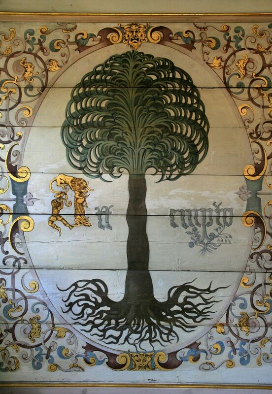 Das Residenzschloss Urach zieren bis heute innen wie außen zahlreiche Palmendarstellungen und versprühen exotisches Flair. Die älteste nachgewiesene Darstellung befindet sich an der Decke des Torturms beim Residenzschloss – zusammen mit der bedeutungsvollen Jahreszahl 1474, dem Jahr der Heirat des Grafen. Vermutlich war es seine italienische Ehefrau Barbara Gonzaga, die ihm den Brauch ihrer Landsleute näherbrachte, eine sogenannte »Imprese« zu führen. Eine Imprese ist ein symbolisches Bild, das – anders als ein Wappen – nur einer bestimmten Person zugeordnet wird. Graf Eberhards Wahl fiel auf die exotische Palme: Sie steht für Kraft, Stärke, ewiges Leben und Fruchtbarkeit. Die Eberhard-Karls-Universität Tübingen, die 1477 von ihm und seiner Mutter Mechthild gegründet wurde, führt die Palme bis heute in ihrem Logo.