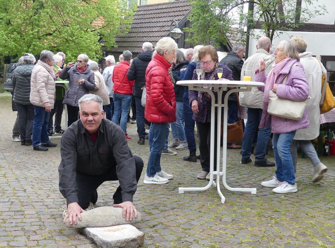 An einem Mahlstein führt der stellvertretende Bürgermeister Alexander Zimmermann vor, wie Getreide in früherer Zeit zu Mehl verarbeitet wurde.