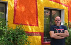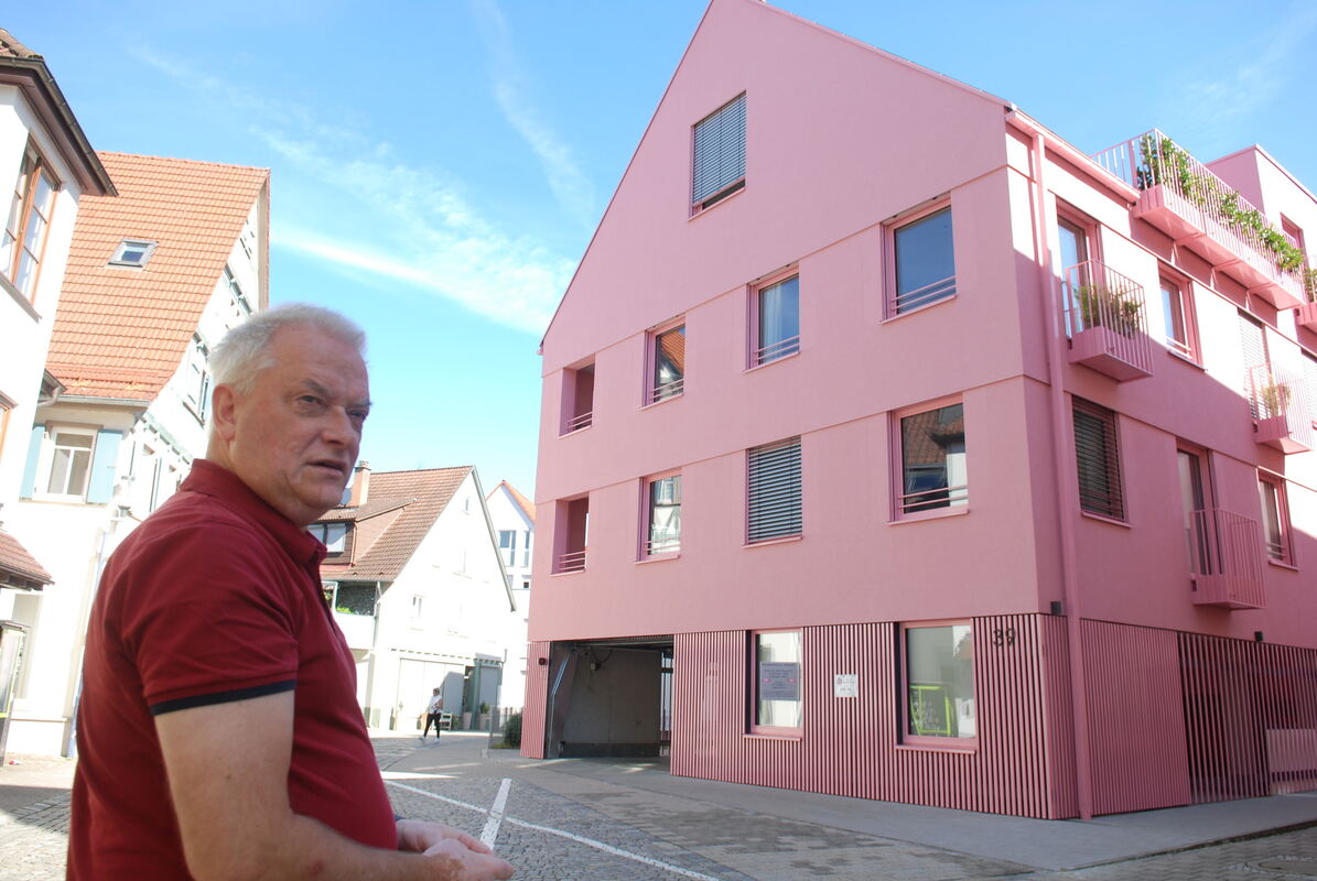 Rot trifft rosa: Stefan Köhler, einer der drei Bauherrn des bonbonfarben gestrichenen Dreigeschossers in der Pfleghofstraße 39.
