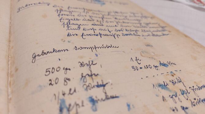 Gertrud Goudswaard ist eine Patin des Besuchsdienstes Wannweil (BdW). Hier ist sie am Kaffeetisch von Marianne Steimle zu sehen. Sie lesen gemeinsam in dem handgeschriebenen Kochbuch der 92-jährigen Wannweilerin, manchmal gehen sie auch spazieren. Wenn Gertrud kommt, serviert Marianne immer Kuchen – heute gibt's Frankfurter Kranz.