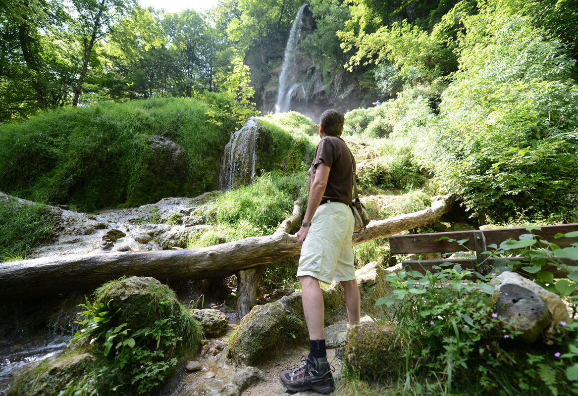 Ein Wanderer am Fuße des Uracher Wasserfalls. FOTO: KAUFMANN/DPA