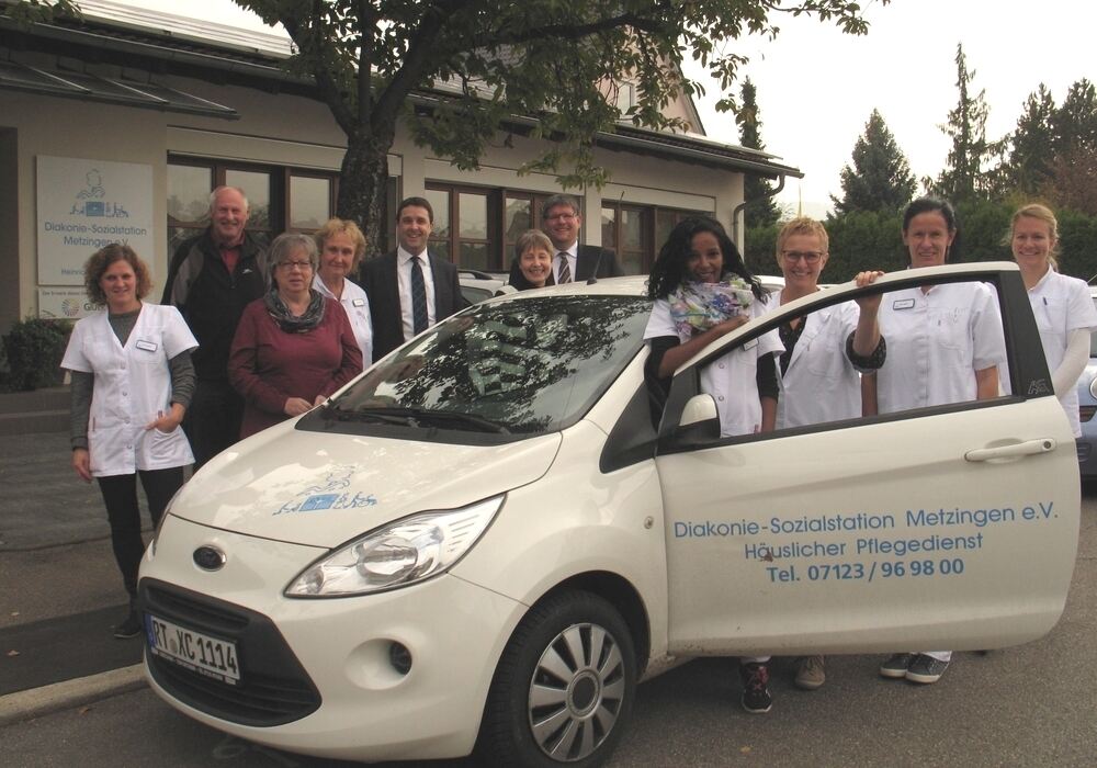 Mitarbeiter der Diakonie-Sozialstation zusammen mit dem Vorstandsmitglied Gotthold Müller, dem Geschäftsführer Jens Mews und Oberbürgermeister Ulrich Fiedler vor dem Gebäude in der Heinrich-Heine-Straße, von wo aus die Einsätze koordiniert werden.