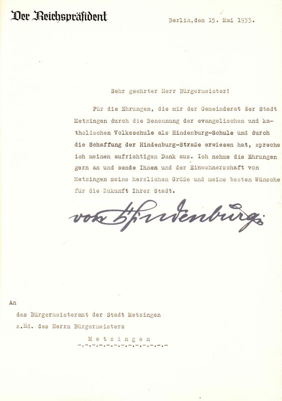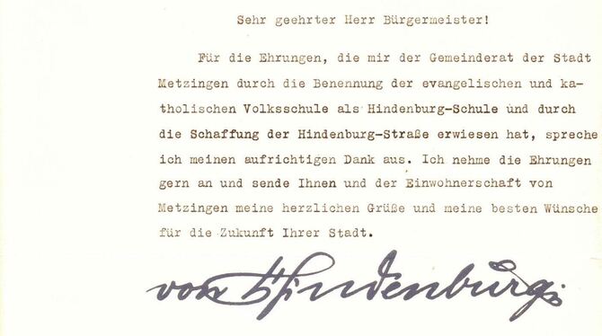 Bürgermeister Carl teilte am Tag darauf die Benennungen brieflich dem Reichspräsidenten und dem Reichskanzler mit. Während Reichskanzler Hitler lediglich durch seinen persönlichen Referenten, Regierungsrat Dr. Meerwald, seinen Dank ausrichten ließ, antwortete Reichspräsident von Hindenburg mit einem eigenen Schreiben. »Sehr geehrter Herr Bürgermeister! Für die Ehrungen, die mir vom Gemeinderat der Stadt Metzingen durch die Benennung der evangelischen und katholischen Volksschule als Hindenburgschule und durch die Schaffung der Hindenburgstraße erwiesen hat, spreche ich meinen aufrichtigen Dank aus. Ich nehme die Ehrungen gern an und sende Ihnen und der Einwohnerschaft von Metzingen meine herzlichen Grüße und meine besten Wünsche für die Zukunft Ihrer Stadt von Hindenburg.«