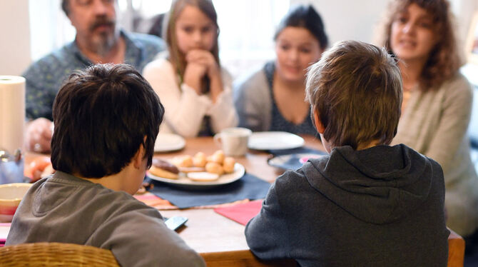 Eltern einer Bereitschaftspflegefamilie sitzen mit ihren Kindern Jana und Jenny und zwei Pflegekindern am Kaffeetisch. FOTO: DPA