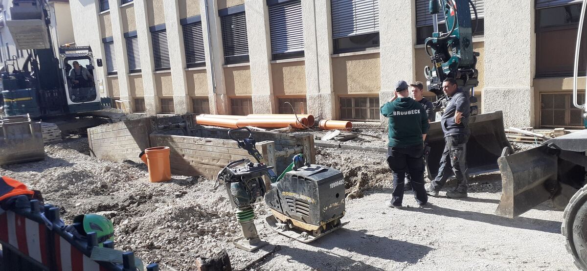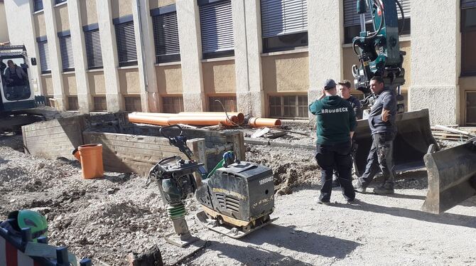 In der Tiefe der Karlstraße verlegen Bauarbeiter neue Abwasserrohre.