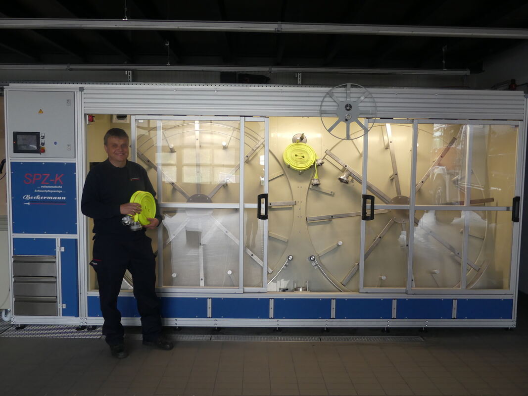 Rübgartens Abteilungskommandant Friedhelm Laux hält einen C-Schlauch in der Hand. Dieser ist 15 Meter lang. Die Waschanlage reinigt und prüft die benutzten Schläuche. Am Ende werden sie schön aufgewickelt und sind wieder einsatzbereit.