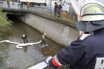 Mit schwerem Gerät und in Handarbeit kämpften die Freiwilligen Feuerwehren zwischen Metzingen und Plochingen gegen die 3 500 Liter Öl, die am Donnerstagsmorgen in die Erms gelaufen sind.