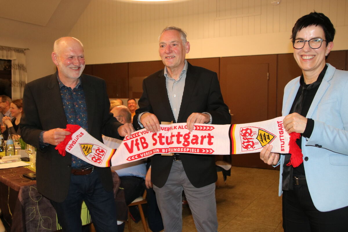 Wengerter mit einem großen Herz für den VfB Stuttgart: Zum Abschied bekam Geschäftsführer Jörg Waldner (Mitte) von Gerhard Fritz und der Oberbürgermeisterin Carmen Haberstroh ein Fanpaket rund um seinen Lieblingsverein überreicht.