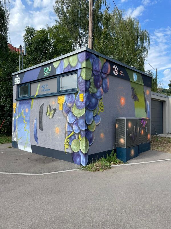 METZINGEN. Vielen sind die großen Weintrauben am Kreisverkehr von Metzingen Richtung Neuhausen schon aufgefallen. Bei dem hübschen Häuschen mit den blauen und lila Trauben, den bunten Schmetterlingen und einem angedeuteten großen Weinblatt auf graublauem Hintergrund handelt es sich um die Gasdruckverteilerstation der Stadtwerke Metzingen. Diese steht am Kreisverkehr Ulmerstraße, Wielandstraße und Metzinger Straße.