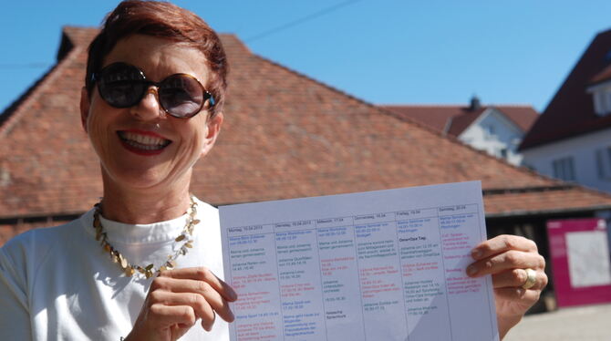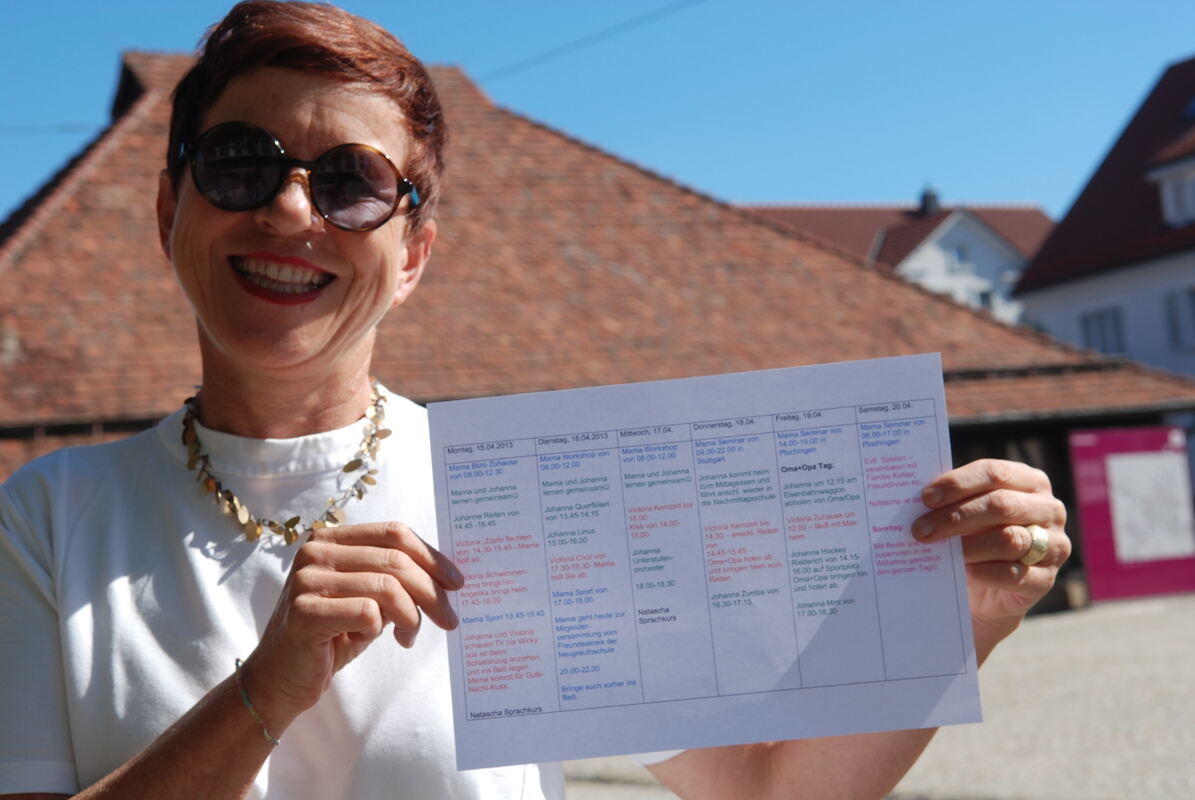 Victoria ist rot, Johanna grün, Mama blau, Au-Pair Natascha schwarz: Ingrid Walter-Kühfuss mit einem Wochenplan für die damals noch zehn Jahre jüngeren Kinder. FOTO: PFISTERER