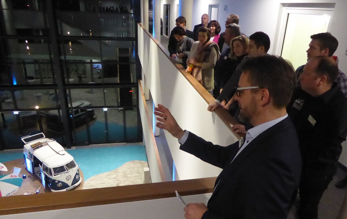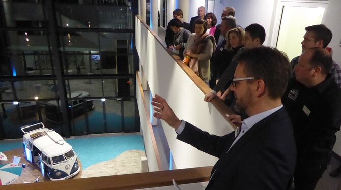 Beim Unternehmergespräch bei Advanced Unibyte führte dessen Chef Sandro Walker (vorn) durch die Räume. Der VW-Bulli im Eingangsbereich ist nicht nur ein echter Oldtimer, sondern auch zum Erkennungszeichen der Firma geworden. FOTO: BERNKLAU