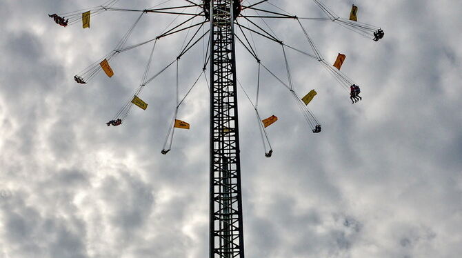 METZINGEN. »I frai mi drauf und bin g’spannt!«, sagt Leni Kuhn und besteigt das größte mobile Kettenkarussell der Welt auf dem Hugo-Boss-Platz. RRRR! Die Sicherungsstange rattert über die Ketten, an denen die Sitze hängen. Das erinnert noch an Klassiker wie »Wellenflug«, doch gleich darauf ist Schluss mit der Ähnlichkeit. WRROOOM! Brummend und heulend schiebt sich der Ring mit den 32 paarig angeordneten Sitzen den Turm hoch, 10 Zentimeter pro Sekunde, bis auf 80 Meter. Je höher desto schneller dreht der Ring, bis auf 70 Stundenkilometer. Die Sitze blitzen unten. Oben haben die Drehflieger den großen Blick über die Stadt bis zum Weinberg und zum Albtrauf – in Schräglage, weil die Fliehkraft sie nach außen drückt. Lautlos dreht sich der Ring, wie ein Propeller oder ein riesiges Mobile, nur berieselt von dezenten Pop-Rhythmen aus den Lautsprechern. »JUUH!« Ein paar Jubelschreie sind zu hören.