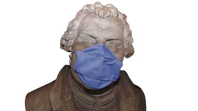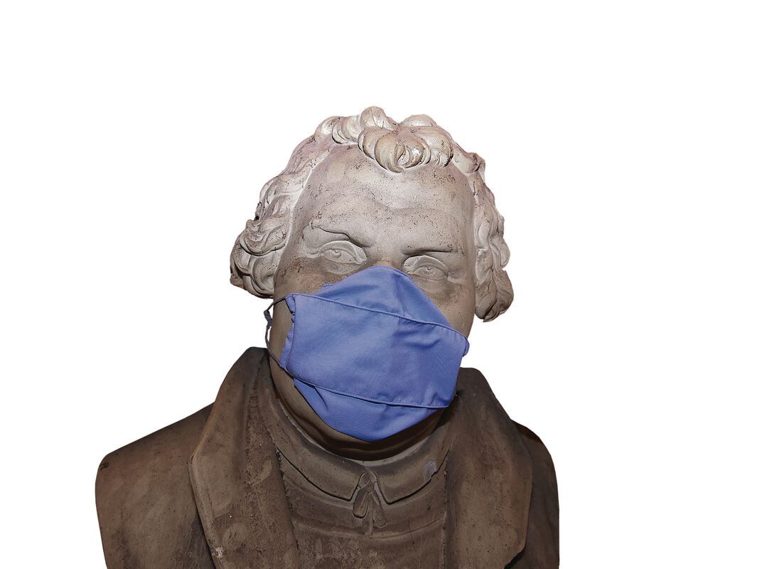 Eine Gipsbüste von Martin Luther steht auf der Stifts-Bühne – für den Fotografen mit Maske.