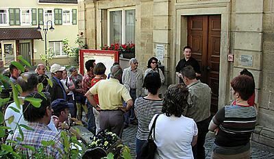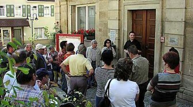 Historischer Rundgang, hier vor dem Rathaus Walddorfs. Oliver Wetzel (im Türrahmen stehend) erläuterte die Geschichte.