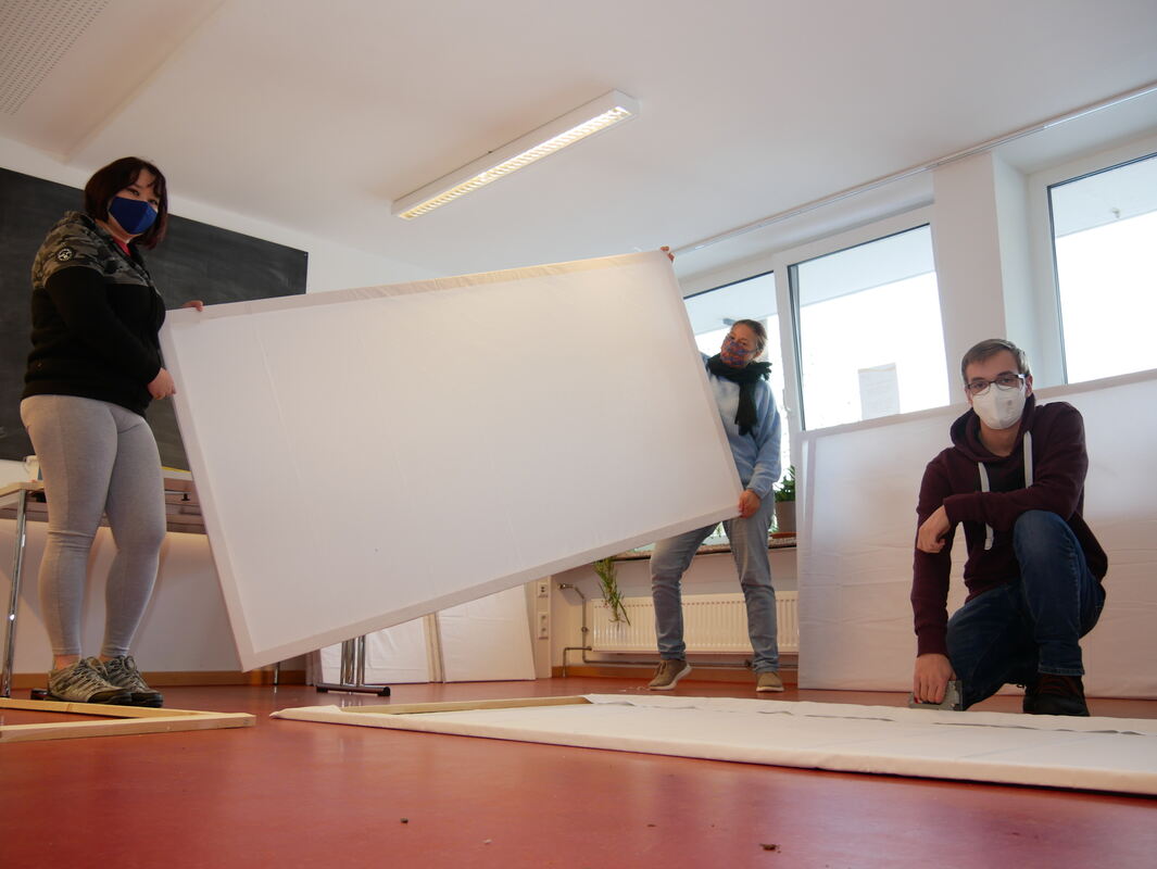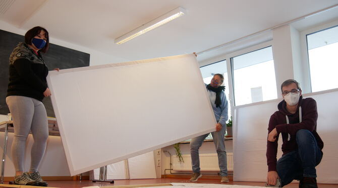 Während die Jugendherberge Bad Urach coronabedingt geschlossen ist, kümmert sich Herbergs- mutter Cornelia Dreher (Mitte) zusammen mit den Freiwilligendienstlern Nigora Rasulova (30) aus Tadschikistan und Philipp Kaiser (17) aus Dettingen um die Aufhübschung der Innenräume. Den Laden schmeißt Cornelia Dreher zusammen mit ihrem Mann Luis Molina. Der Mexikaner ist gerade außer Gefecht, weil er sich das Sprunggelenk gebrochen hat. FOTOS: FINK