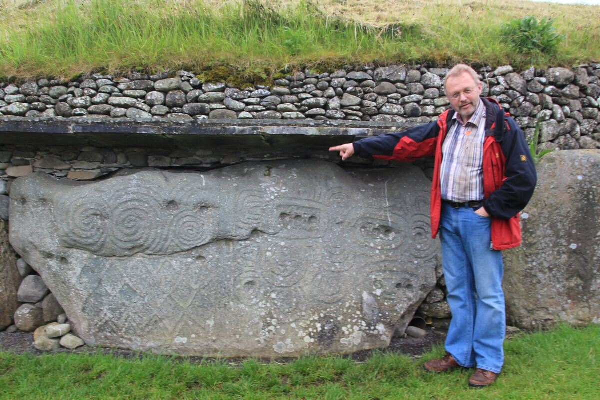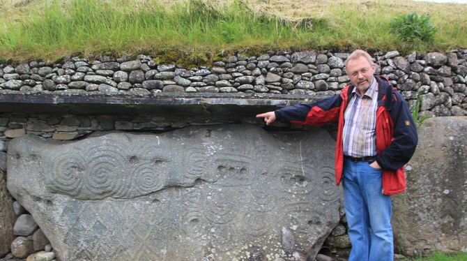 Irland ist nicht nur grün, sondern auch geschichtsträchtig: Eckard Ladner erklärt einen geschnitzten Stein aus der Jungsteinzeit bei Newgrange.