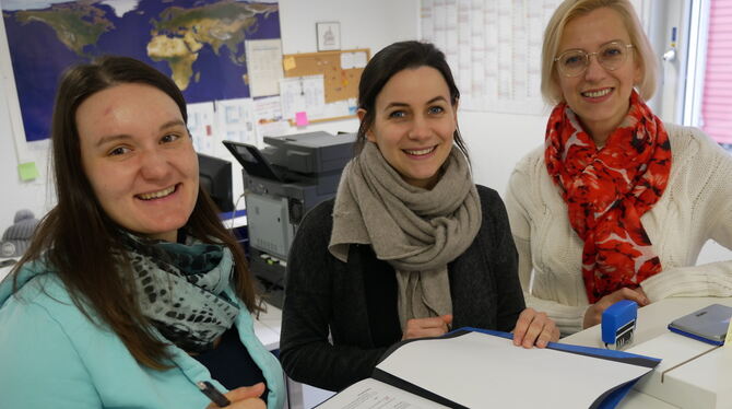 Tanja Becker (links), Maha Zaghi und Tetyana Schneider (Karina Montes fehlt auf dem Foto) sind Metzingens Integrationsmanagerinnen, sie kümmern sich um alle Belange des täglichen Lebens von Flüchtlingen. FOTO: LEISTER