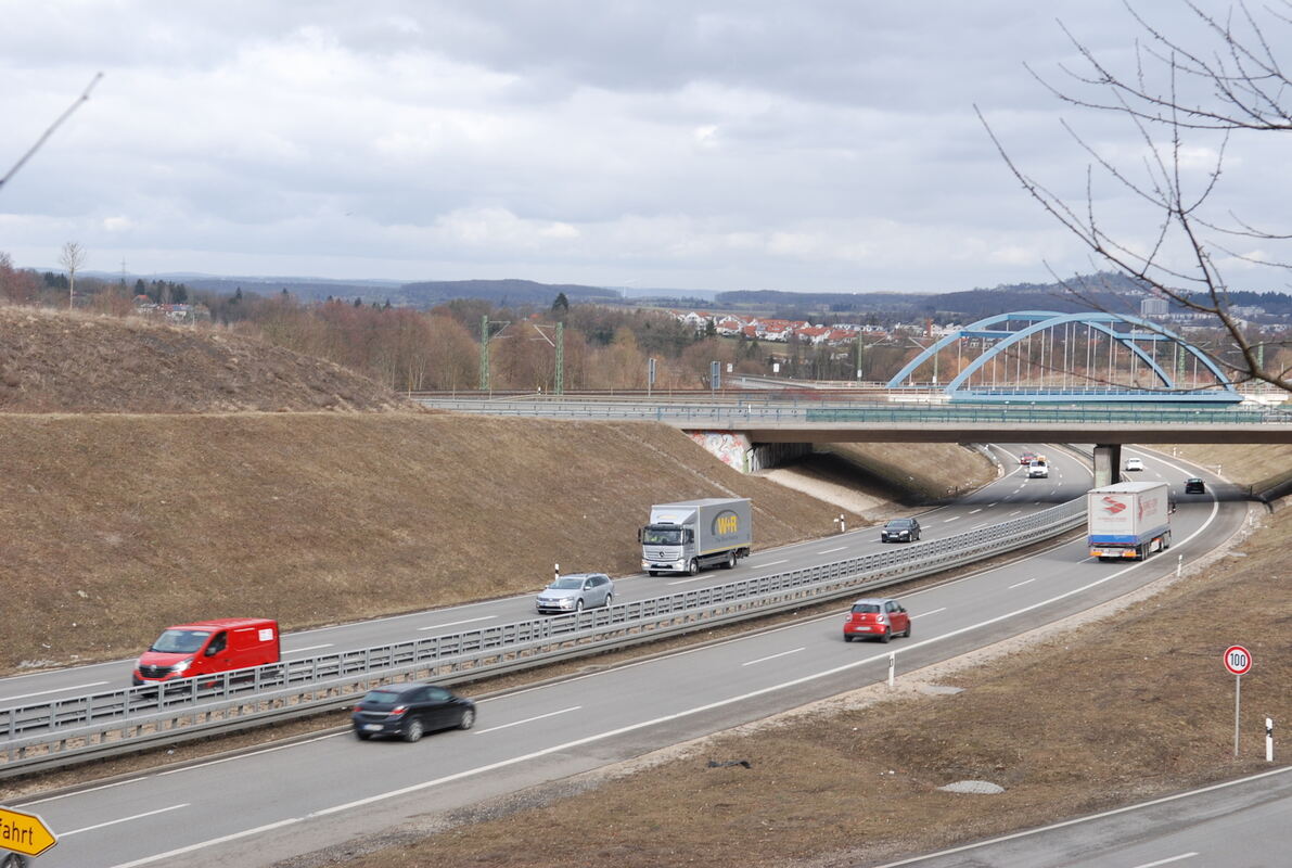 Der Maienwaldknoten bei Metzingen, an dem sich die B 28 Reutlingen – Bad Urach und die B 312 Reutlingen – Stuttgart treffen. Unfallträchtig ist der Abschnitt an und nach der Verengung der B 312 von vier auf zwei Spuren (hinter der Straßen- und der blauen Eisenbahnbrücke).