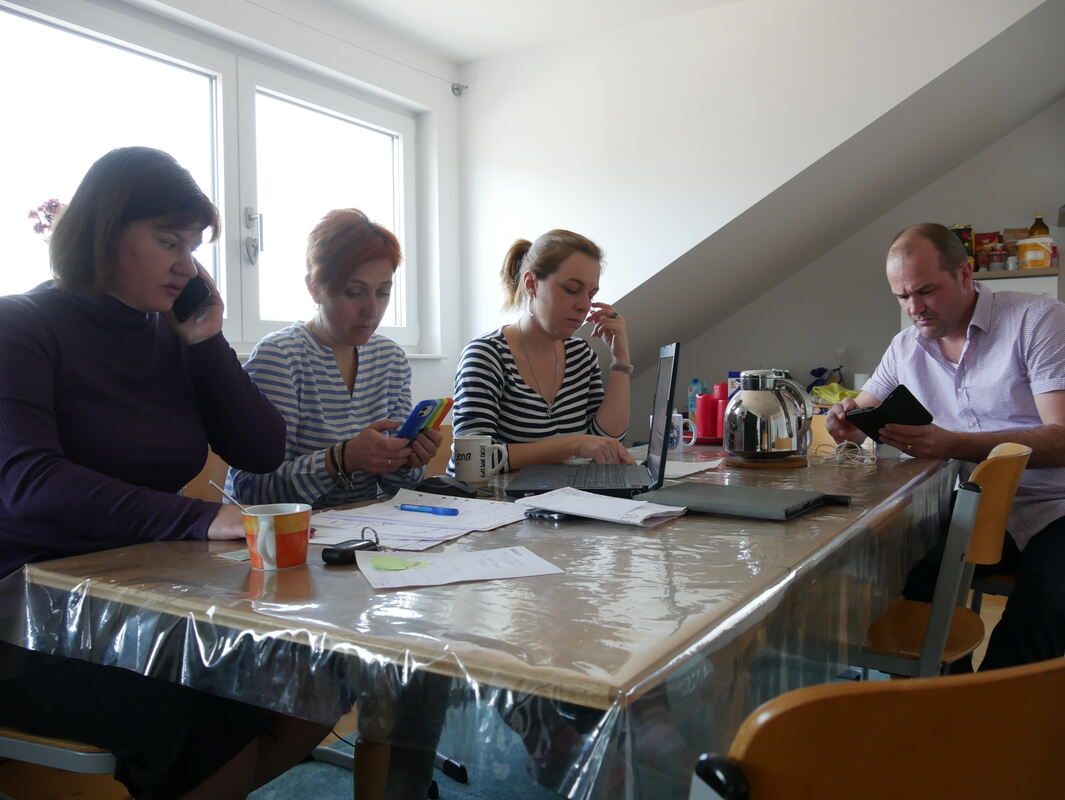 Der Uracher Integrationsbeauftragte Ruben Stapelbroek kümmert sich federführend um Geflüchtete aus der Ukraine. Ihm zur Seite stehen (von links) Olena Menshykova, Liudmila Luzanova und Victoria Miteva, die fließend Deutsch sprechen. Das Bild ist nicht gestellt: Die Vier arbeiten fast ununterbrochen hochkonzentriert.