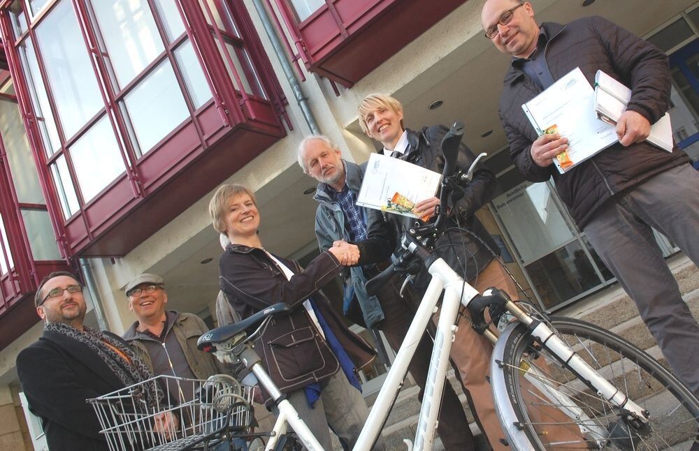 Frank Riedel, Dieter Ramminger, Elke Haubold-Schüle, Kurt Drechsler und Thomas Lusch vom Zukunftsteam (von links) haben die Ergebnisse des Klimaschutztests an Bürgermeisterin Jacqueline Lohde und Gerhard Linder vom städtischen Bauamt übergeben.
